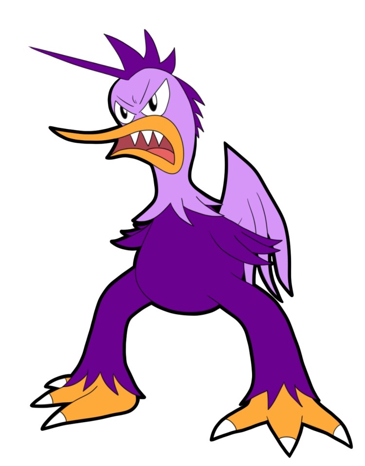 Characterized by their gloomy purple feathers and their puny wings, the Chickenoso stands about 2-3 feet tall when roosting. However, everything changes when the Chickenoso goes on a tantrum-filled rampage. When they stretch their legs out completely, they can stand up to twice their previous height! The legs are strong and muscular and allow for amazing running speeds and deadly kicks.